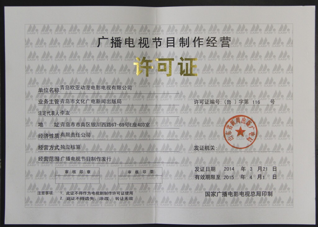 青島影視公司,專業(yè)青島影視制作公司-青島歐亞動漫電影電視有限公司是歐亞集團下屬專業(yè)公司,注冊資金三百萬元,并已取得廣播電視節(jié)目制作許可證。
